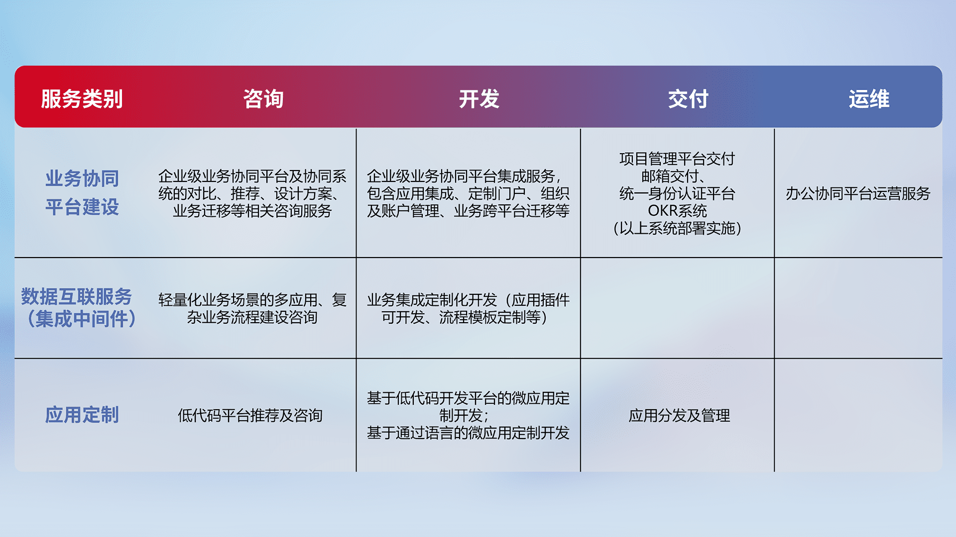 针对钉钉、、企微、、IDaas等平台级产品提供产品的规划、、、方案、、、交付、、、、定制化开发等服务,,实现如统一协同办公、、智能客户服务、、混合会议管理、、、、智能数据查询、、等业务场景,,,,实现数字化转型。。。