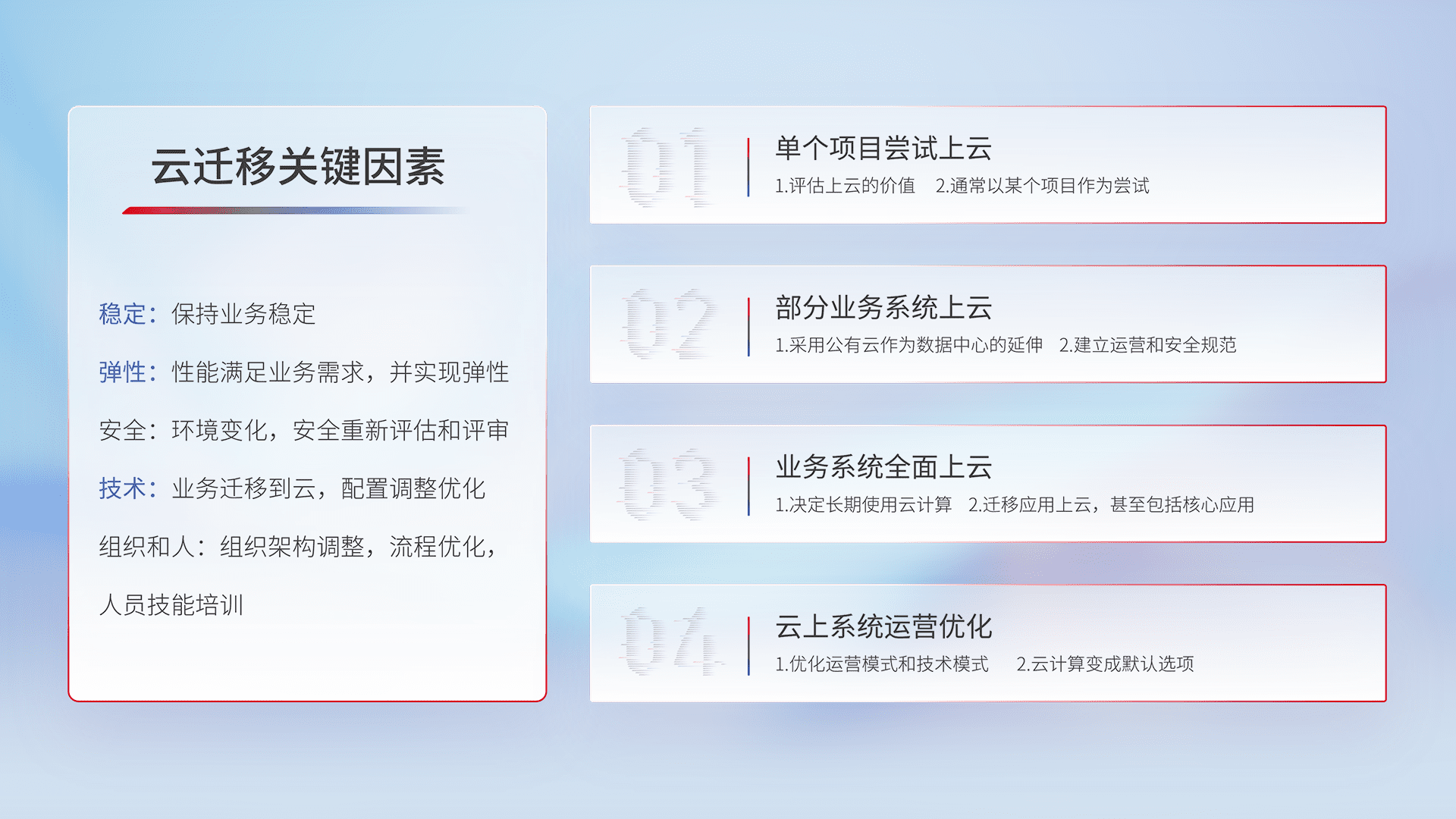 结合实际业务,,,,从规划设计、、、云平台选型、、、、云原生改造、、数据迁移、、、集成交付,,,,迁移全过程为客户识别最佳上云路径,,,,做好风险识别管理,,,设计网络架构、、身份权限、、、、安全审计合规、、、、操作审计、、日志审计、、、监控告警策略、、、多站点容灾设计等,,,,对云上基础设施进行整体规划,,,,提升IT治理水平,,以满足弹性、、高可用、、、高性能的需求。。