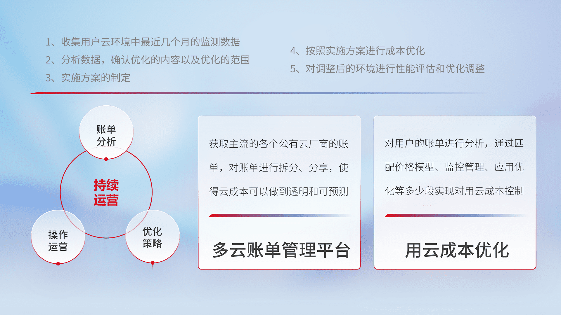 通过多云纳管,,,,以统一的资源数据模型把客户的云资源进行抽象和封装,,进而实现对多云资源的统一操作,,保障云资源管理的可靠性、、、、稳定性与可用性。。。。量身定制化运维内容,,,配置、、、开发运维、、、补丁管理、、、备份、、、监控、、认证和访问管理、、、审计和日常巡检等,,,保障在用云过程中的可靠度,,稳定度以及高可用率。。。